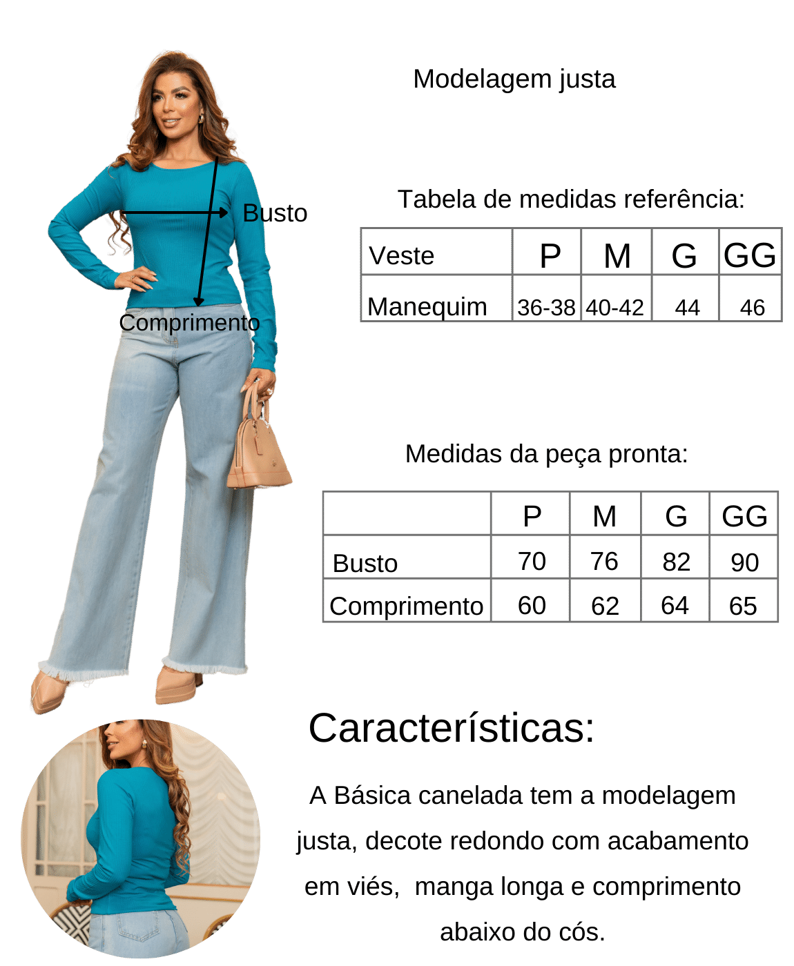 A básica canelada manga longa é a peça perfeita para quem busca um caimento ajustado, com decote redondo e acabamento em viés, manga longa e comprimento abaixo do cós. Se molda delicadamente ao corpo, realçando a silhueta de forma elegante. Sua versatilidade permite inúmeras combinações de looks, seja com calça jeans, social, legging ou saias. Além disso, pode ser facilmente complementada com casacos sobrepostos ou cardigans, garantindo um visual sempre sofisticado e moderno.