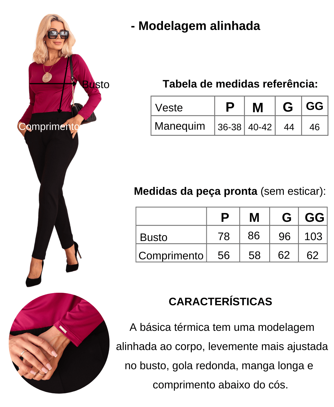 A básica térmica é uma peça indispensável para garantir conforto nos dias gelados. Com um corte que se adapta perfeitamente ao corpo, ela é ideal para ser usada por baixo de casacos, blazers ou até mesmo sozinha em dias mais amenos. Feita com um tecido térmico de alta qualidade e um acabamento impecável, essa peça assegura o máximo de conforto e proteção contra o frio, mantendo o corpo aquecido sem comprometer a liberdade de movimento. Além disso, o modelo inclui a plaquinha da marca no punho, adicionando um charme extra à peça.
