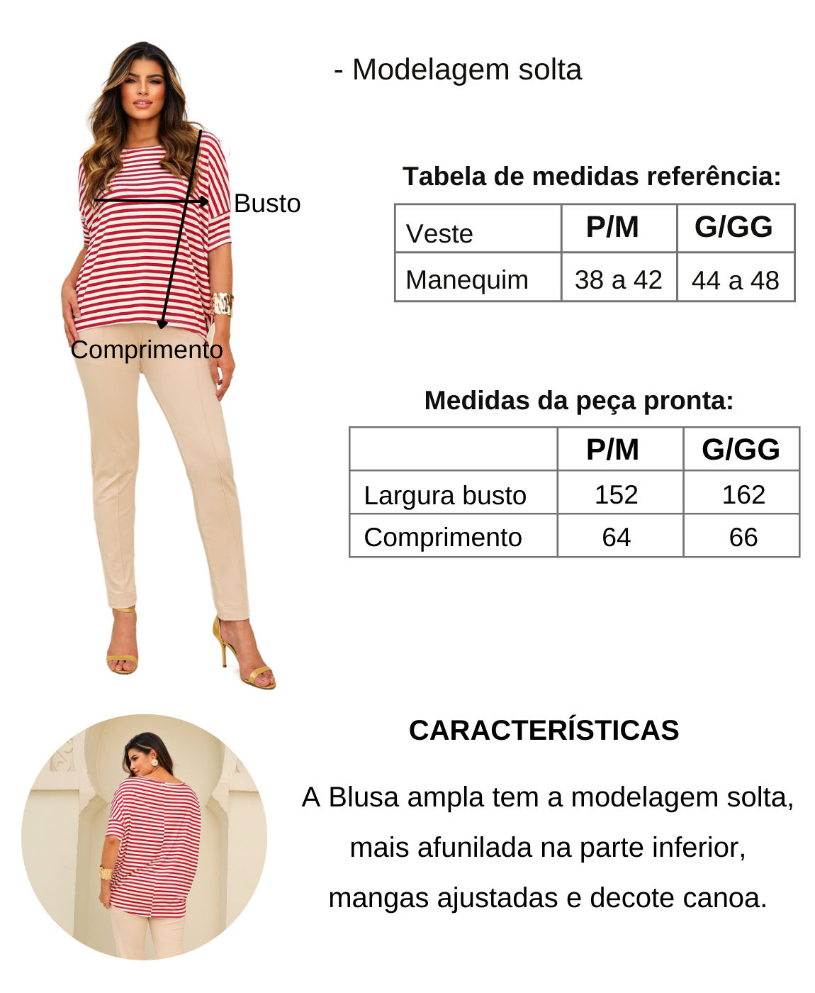 A Blusa Ampla é uma peça perfeita para quem busca conforto e elegância. Com modelagem solta e mangas ajustadas, ela possui um decote canoa e comprimento no quadril, proporcionando um visual mais descolado. Combine-a com calças justas para um look mais equilibrado e sensual, adicionando um saltinho para uma pegada mais refinada ou tênis para um visual descontraído. Para dar um toque extra, aposte em colares mais longos, que ajudam a alongar a silhueta e complementar o visual.