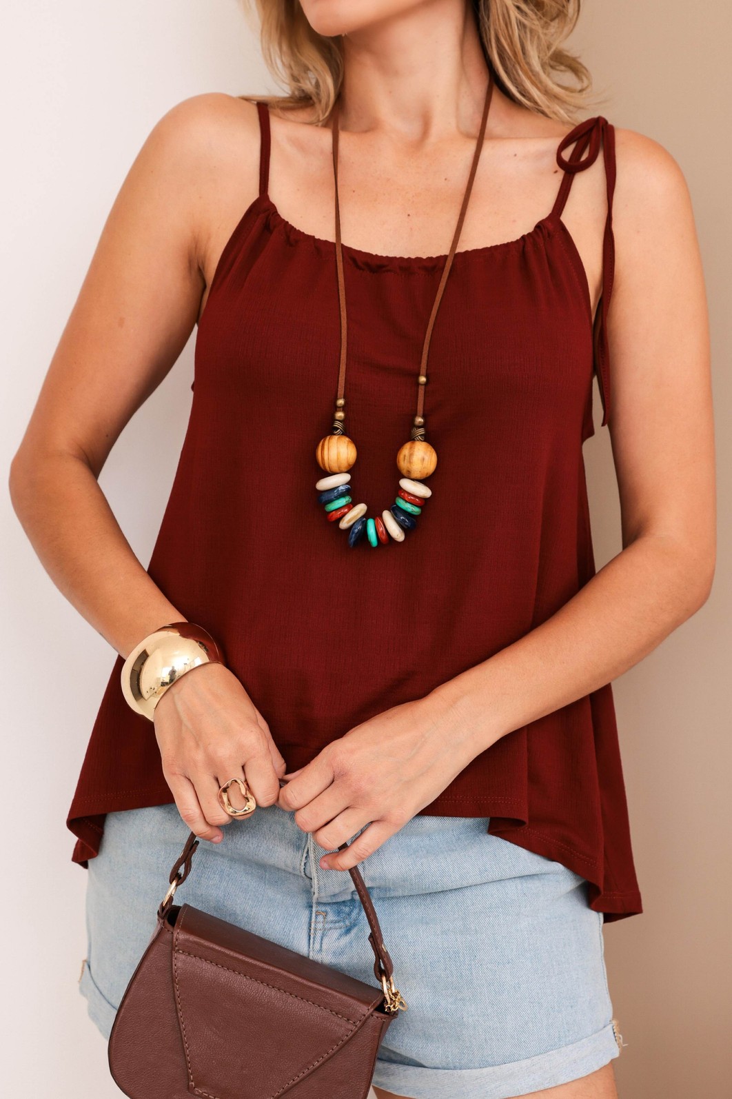 A peça perfeita para quem busca conforto e estilo nos dias mais quentes. Essa blusa regata em tom marrom terroso traz um caimento leve e soltinho, proporcionando frescor e liberdade de movimento. O detalhe de amarração nos ombros garante um toque delicado e moderno, permitindo ajuste conforme a preferência. Versátil, combina facilmente com shorts, saias ou calças, sendo ideal tanto para looks casuais quanto para produções mais arrumadas.