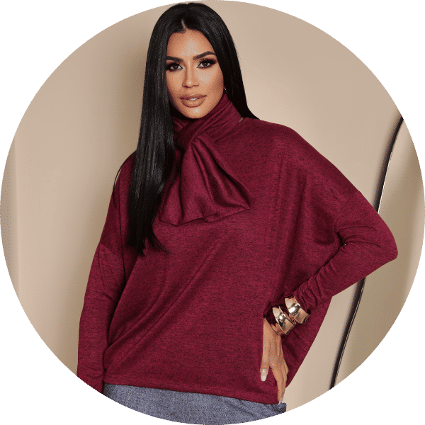 A blusa tem a modelagem solta, levemente mais afunilada no quadril, parte das costas mais comprida, manga longa ajustada, decote redondo.
