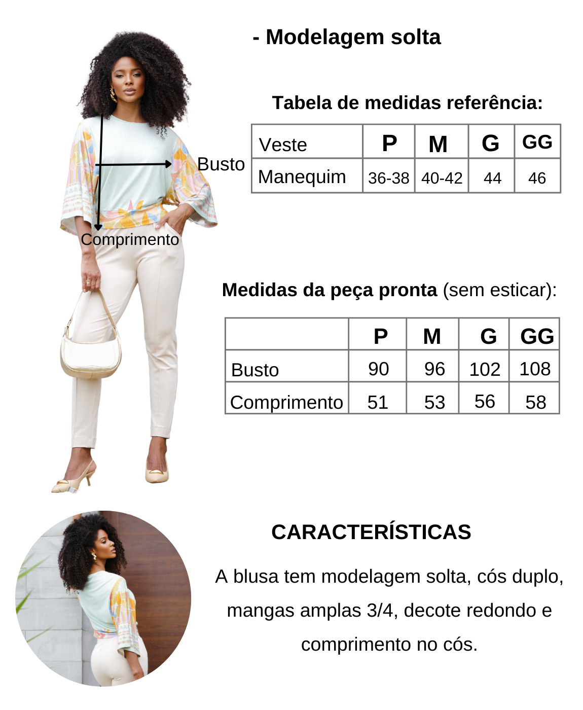 A blusa manga ampla é perfeita para as mulheres que buscam conforto e estilo em uma única peça. Com sua modelagem solta e cós duplo, ela proporciona liberdade de movimento e um caimento impecável. As mangas amplas 3/4 dão um toque moderno e despojado ao look, enquanto o decote redondo valoriza o colo de forma sutil e elegante. O comprimento no cós é ideal para combinar com calças de cintura alta, criando um visual casual e cheio de personalidade. Seja para um passeio no parque ou um happy hour com as amigas, esta blusa é a escolha certa para quem valoriza o conforto sem abrir mão do estilo. Invista nessa peça versátil e arrase em todas as ocasiões!