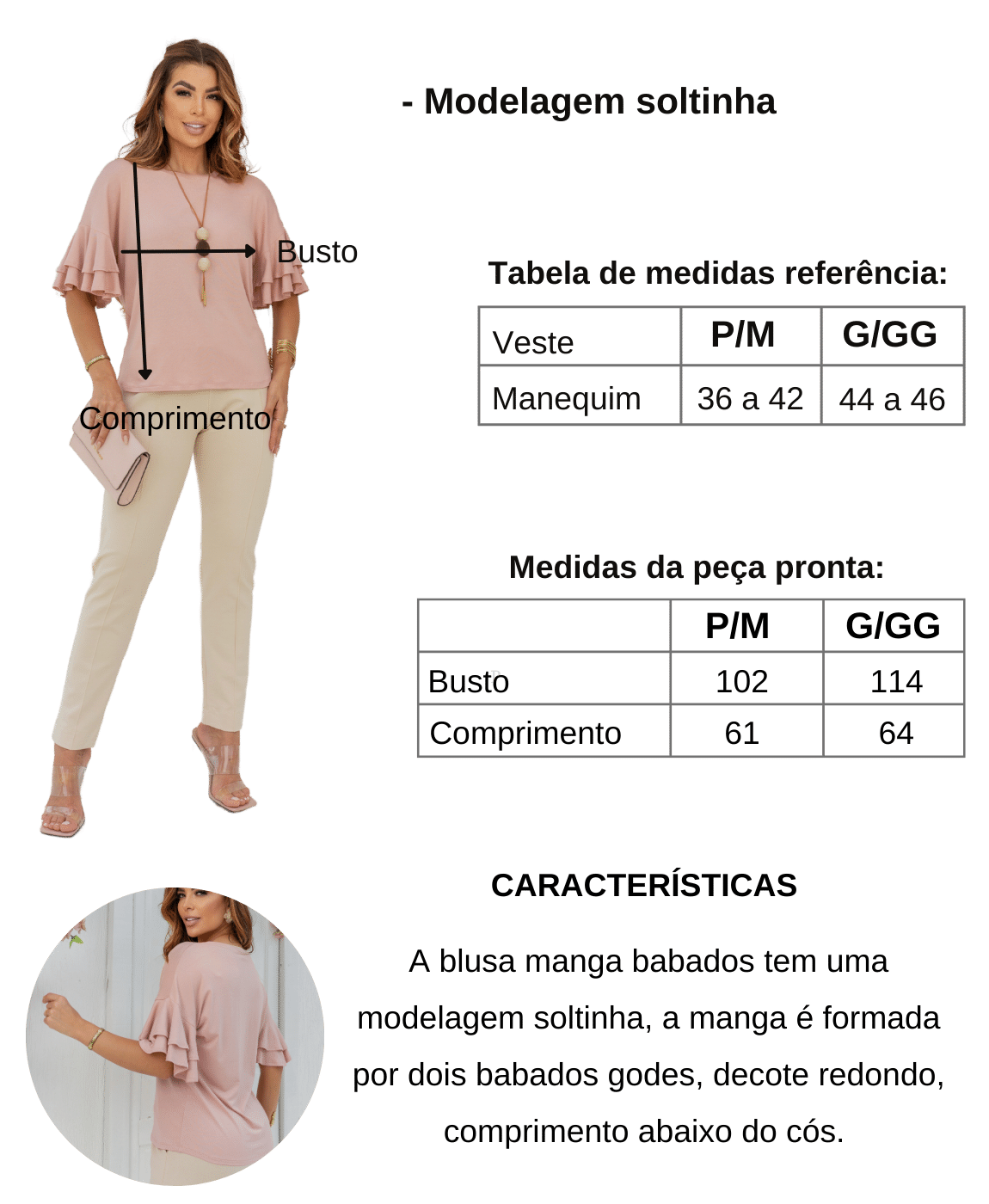 Se você busca um look romântico e cheio de estilo, a Blusa Manga Babados é a escolha perfeita! Seu caimento leve e fluido, combinado com as mangas godê duplas, trazem um toque de feminilidade. O decote redondo e o comprimento abaixo do cós. Aposte nessa peça para arrasar com elegância e delicadeza.