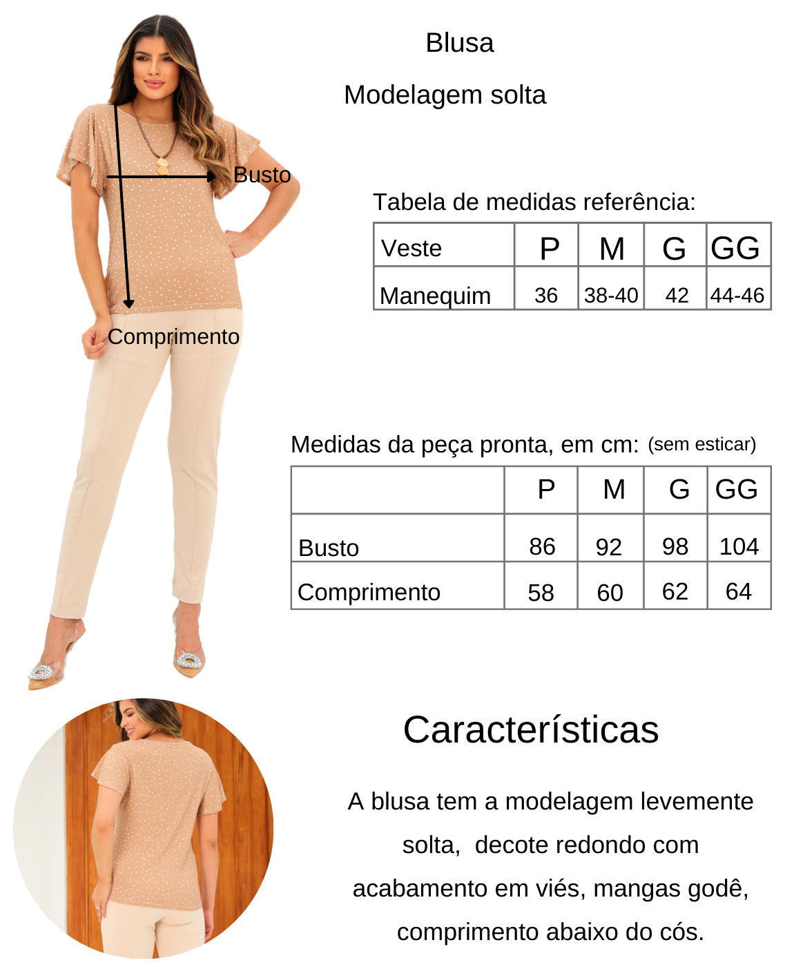A blusa manga godê é a peça perfeita para adicionar um toque de feminilidade e estilo ao seu guarda-roupa. Com uma modelagem levemente solta, ela proporciona conforto e liberdade de movimento, ideal para o dia a dia agitado das mulheres modernas. O decote redondo com acabamento em viés traz um charme extra à peça, enquanto as mangas godê dão um toque de delicadeza e elegância ao visual.