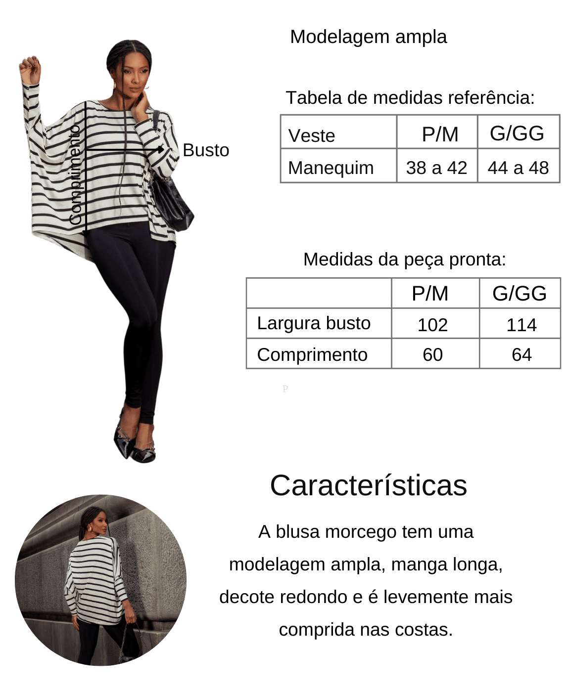 A Blusa Morcego Manga longa é puro conforto e estilo! Com sua modelagem ampla e mangas longa, ela garante aquele toque de sensualidade na medida certa, principalmente se usar com ombros à mostra. Para arrasar com essa peça chic, é só acertar na combinação. Como é oversized, a dica é equilibrar com calças ajustadas e colares longos. Assim, você estará pronta para arrasar com muito conforto e modernidade.