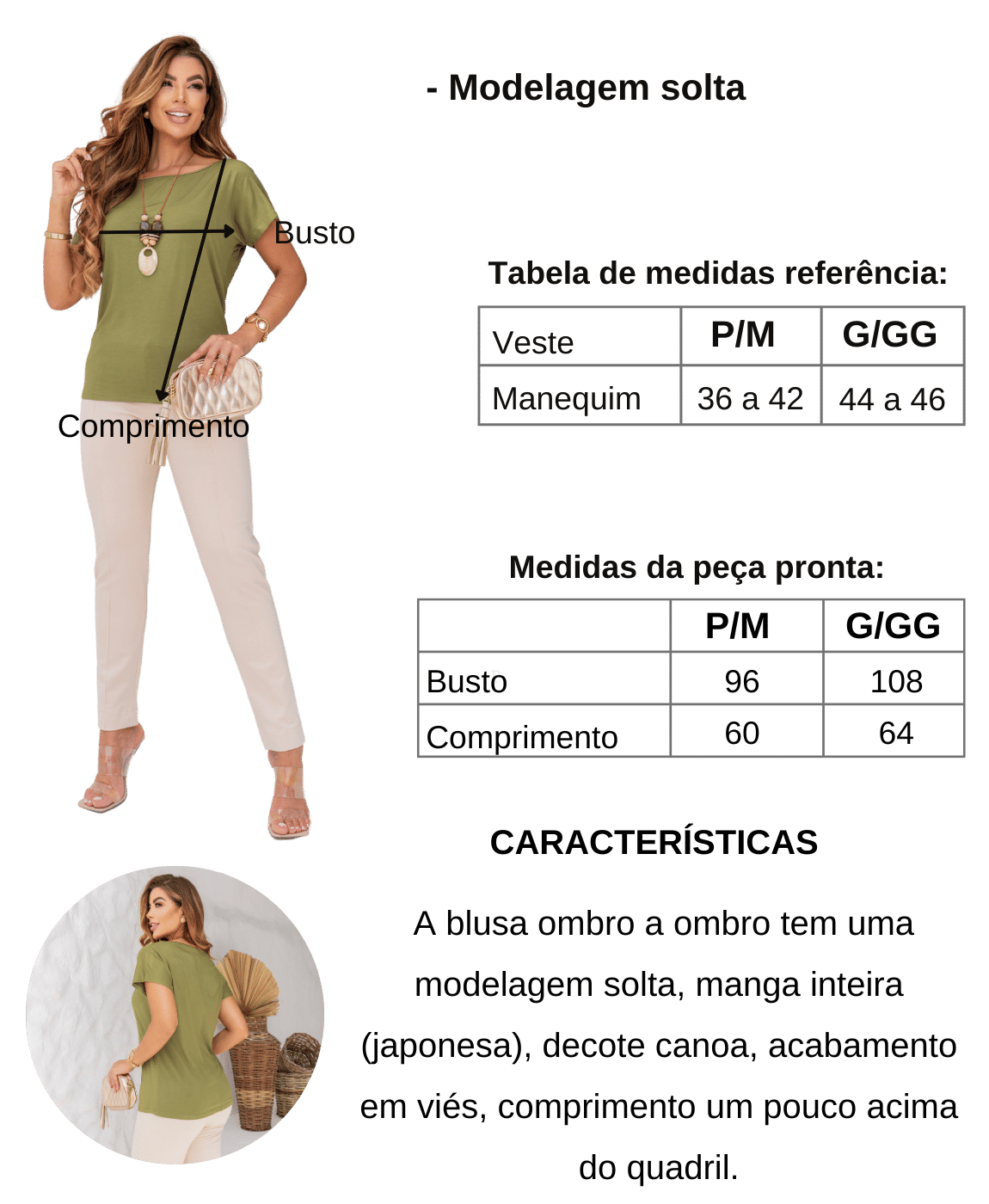 A blusa ombro a ombro é sinônimo conforto, com seu caimento solto e manga inteira estilo japonêsa. Seu decote canoa valoriza o colo, enquanto o acabamento em viés confere um toque refinado à peça. Com comprimento levemente acima do quadril, é a escolha perfeita para um look descontraído e cheio de estilo.