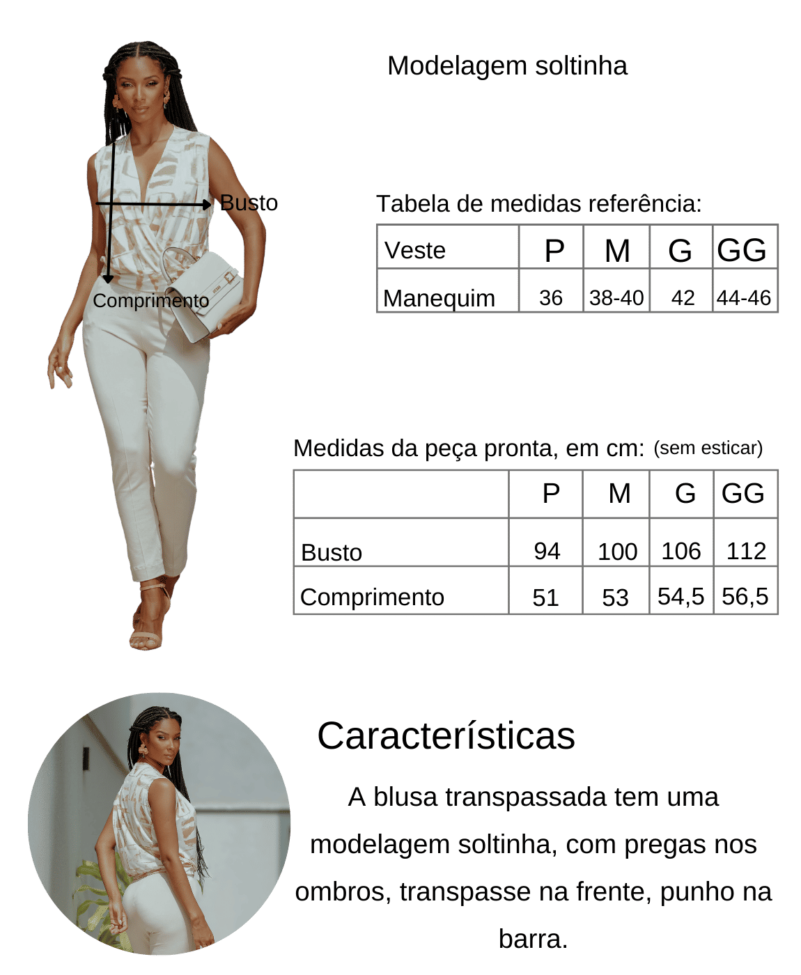 A blusa transpassada é a peça perfeita para aquelas mulheres que gostam de se vestir com conforto e estilo ao mesmo tempo. Com um corte fluido que se adapta perfeitamente ao corpo feminino, essa blusa é a escolha certa para um look descontraído e despojado. Os detalhes de pregas nos ombros dão um toque de sofisticação à peça, enquanto o charmoso transpasse na parte da frente adiciona um ar de modernidade. Punhos na barra acrescentam um acabamento elegante, tornando essa blusa transpassada uma opção versátil que pode ser usada em diversas ocasiões.