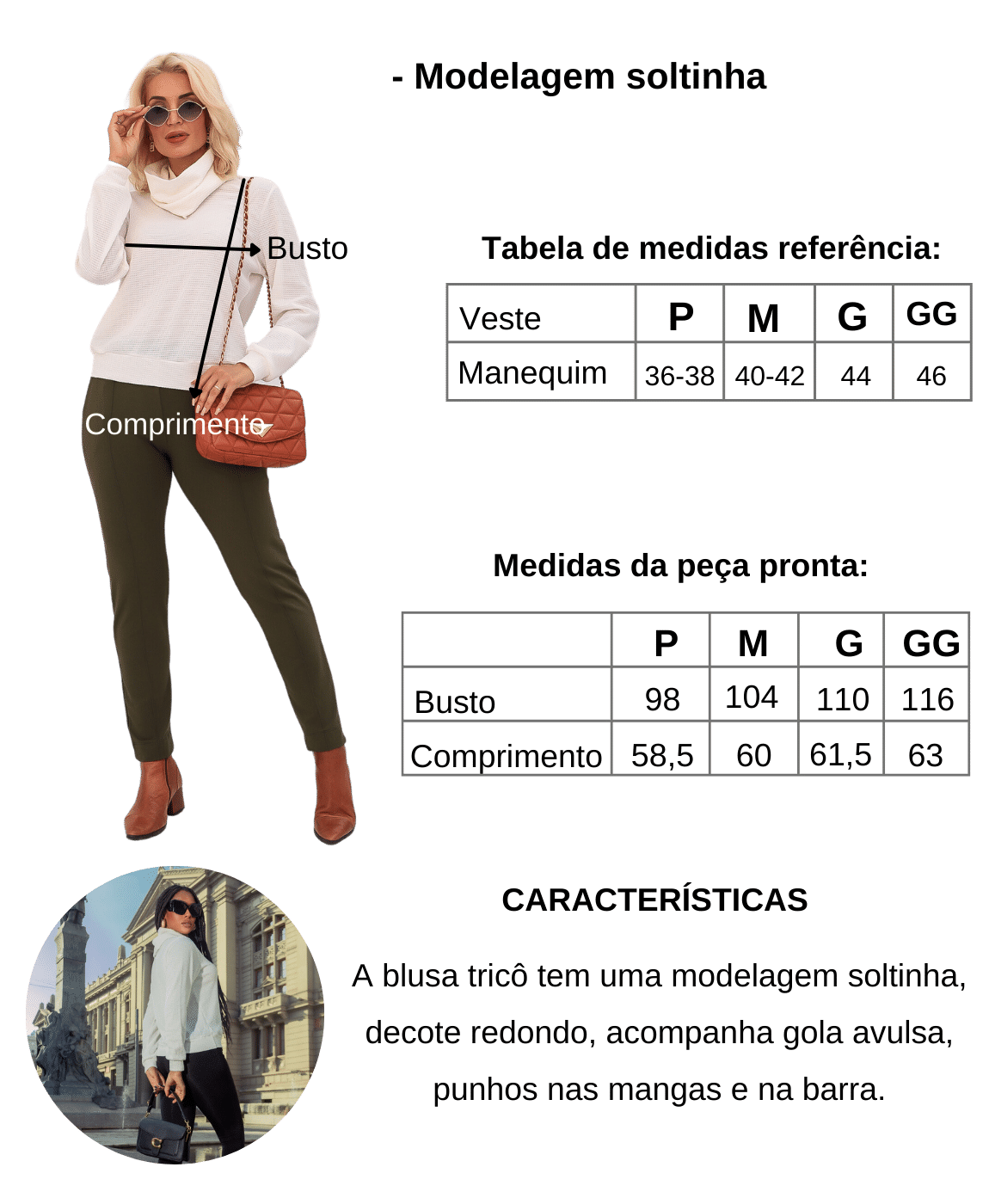 A Blusa Tricô apresenta um caimento leve e despojado, com decote arredondado, além de vir acompanhada de uma gola separada, punhos nas mangas e na barra.