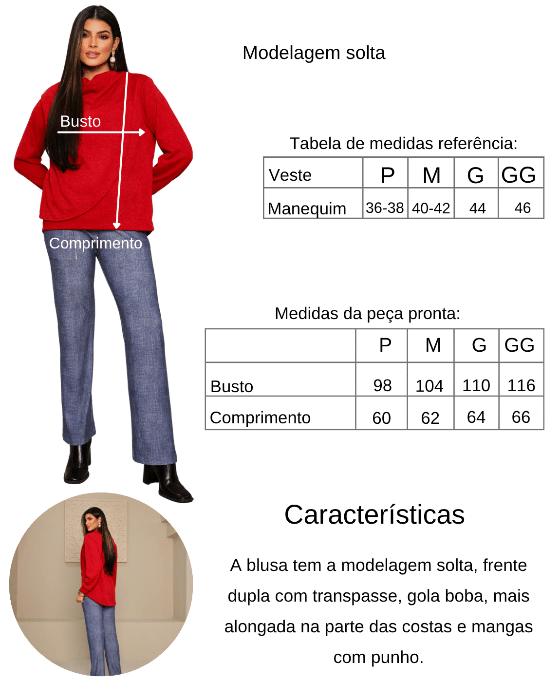 A blusa apresenta um corte solto e moderno, com frente dupla transpassada, gola boba e um comprimento mais longo na parte de trás. As mangas possuem punhos, proporcionando um toque de sofisticação ao look
