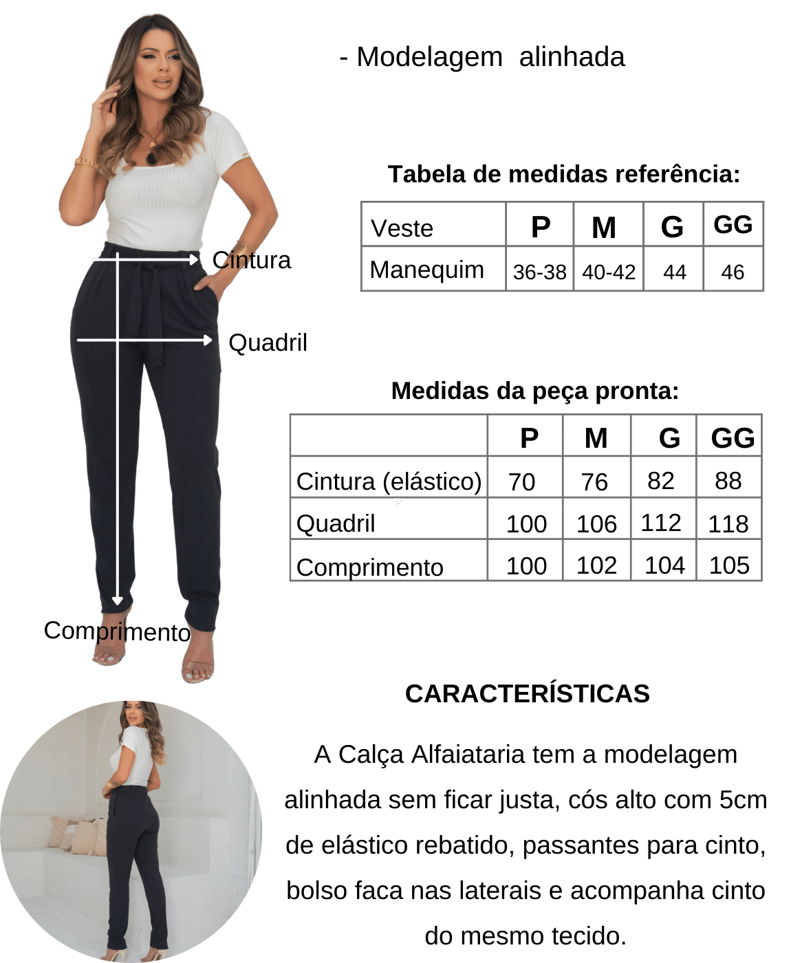 A Calça Alfaiataria apresenta um corte impecável que garante elegância. Modelagem alinhada ao corpo sem ficar justa, com cós alto e passantes para cinto. Além disso, possui 5 cm de elástico rebatido e vem acompanhada de um cinto confeccionado no mesmo tecido. Ideal para quem busca um visual sofisticado.