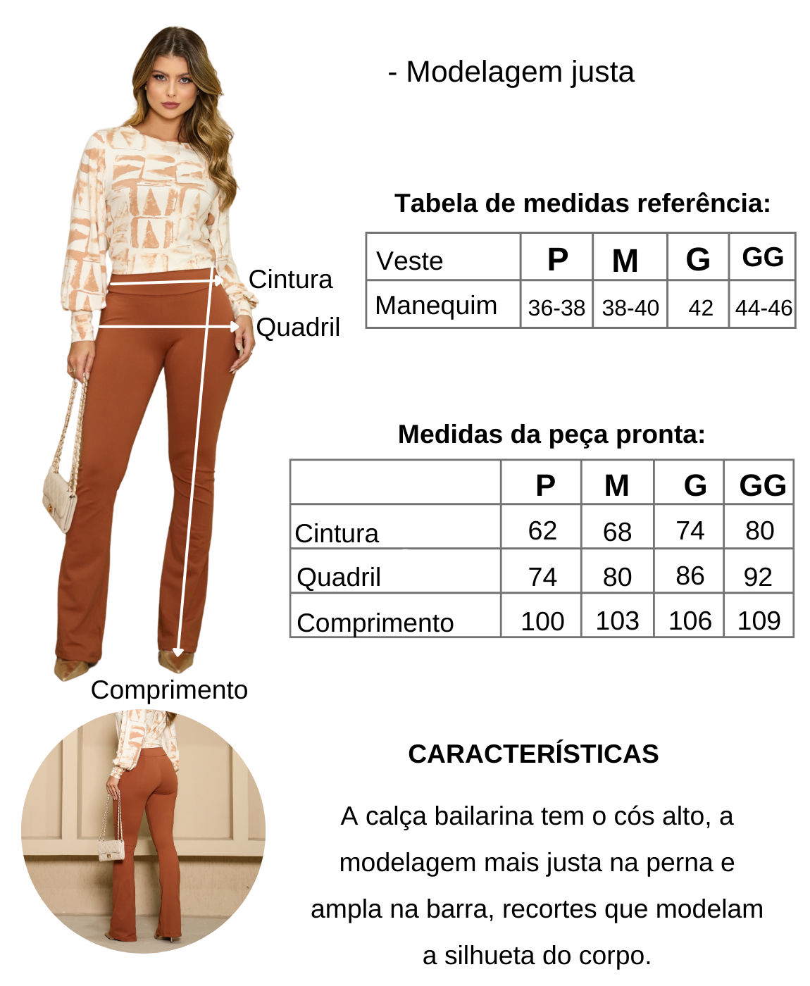 A calça bailarina é o item perfeito para as mulheres que buscam conforto e estilo em uma única peça. Com seu cós alto, proporciona uma sensação de segurança e sustentação, enquanto a modelagem mais justa na perna valoriza as curvas do corpo. Já a barra ampla dá um toque de elegância e leveza ao visual. Feita com tecido de alta qualidade, os recortes estratégicos da calça bailarina ajudam a modelar a silhueta, garantindo um caimento impecável.
