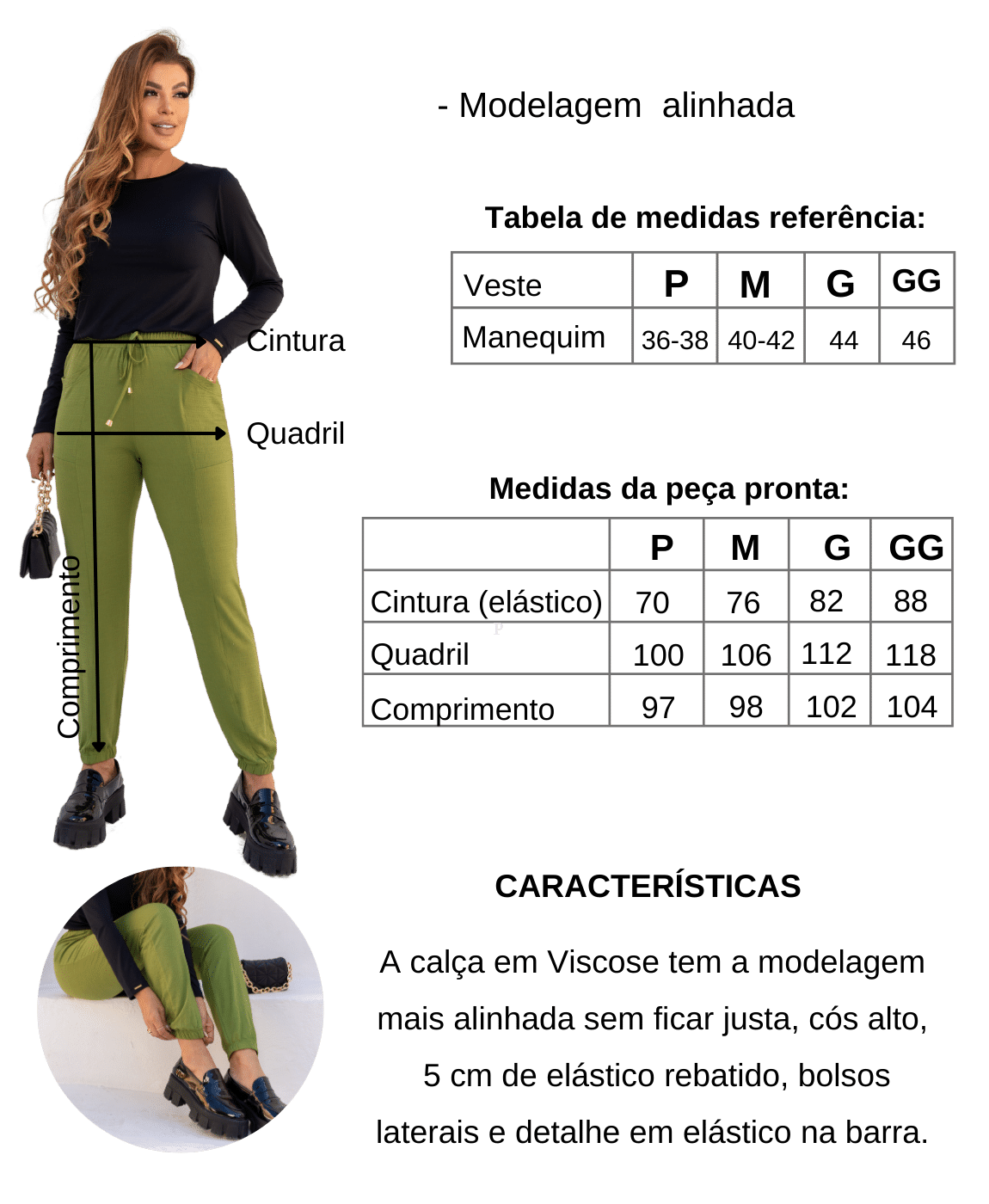 A calça em Viscose tem uma modelagem estilo Jogger. Com cós alto, elástico rebatido de 5 cm, bolsos laterais e detalhe em elástico na barra, ela combina estilo e conforto em uma peça só.