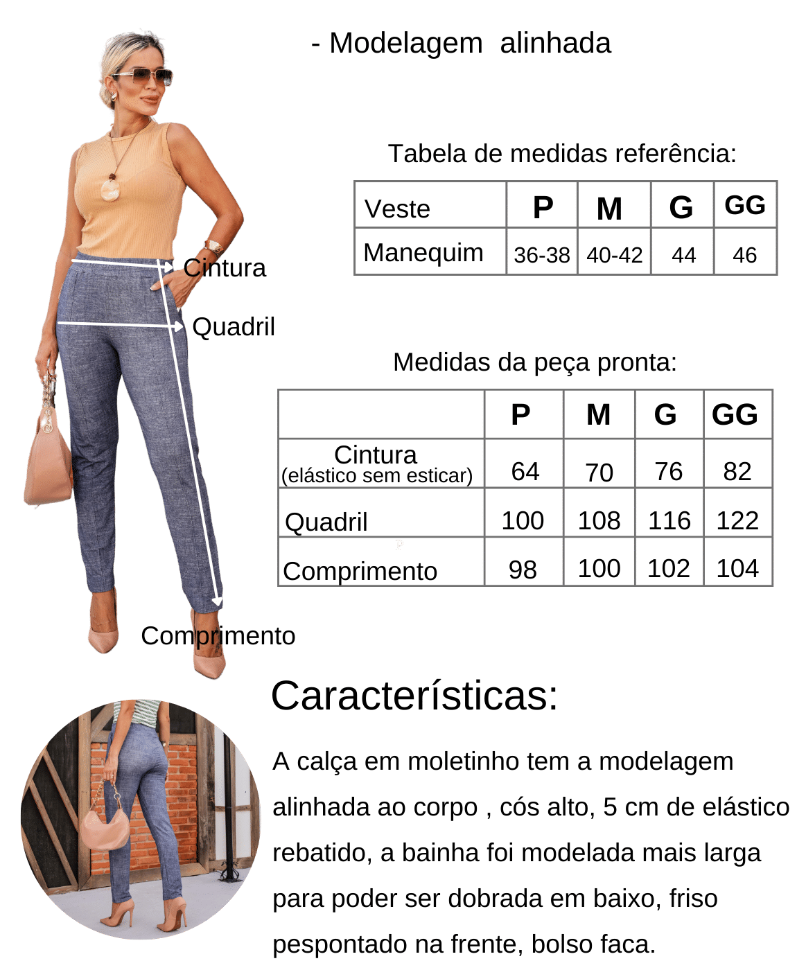 A calça de moletinho foi cuidadosamente projetada para se moldar perfeitamente ao corpo, com um cós alto e elástico de 5 cm de largura. Sua bainha mais ampla permite dobrá-la com estilo, enquanto os detalhes como o friso pespontado na parte da frente e os bolsos faca proporcionam um toque de elegância. Versátil, este modelo pode ser facilmente combinado com tênis e uma blusa básica, ou até mesmo com um blazer e salto alto, para um look mais refinado.