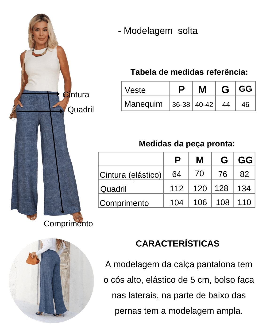 A Calça Pantalona tem a modelagem com o cós alto, elástico de 5 cm e bolso faca nas laterais. Com sua modelagem ampla nas pernas, ela se adapta perfeitamente a todos os tipos de corpo e pode ser usada em diversas ocasiões. Basta combinar com outras peças e acessórios para criar um look elegante e alongar a silhueta. O cós alto ainda ajuda a disfarçar a região da cintura, e você pode usá-la com qualquer tipo de calçado, do tênis ao salto alto. Arrase com essa peça versátil e cheia de estilo!