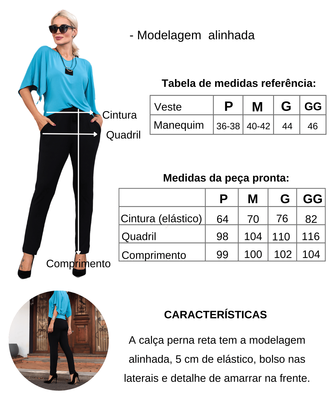 A nossa Calça Perna Reta, com modelagem alinhada, 5 cm de elástico, bolsos laterais e um charmoso detalhe para amarrar na frente. Versátil e fácil de combinar, ela harmoniza com diversas blusas da nossa coleção. Uma excelente opção, além de nossas blusas, são os diversos modelos de colares que temos. Capriche na montagem do seu look com muito conforto.