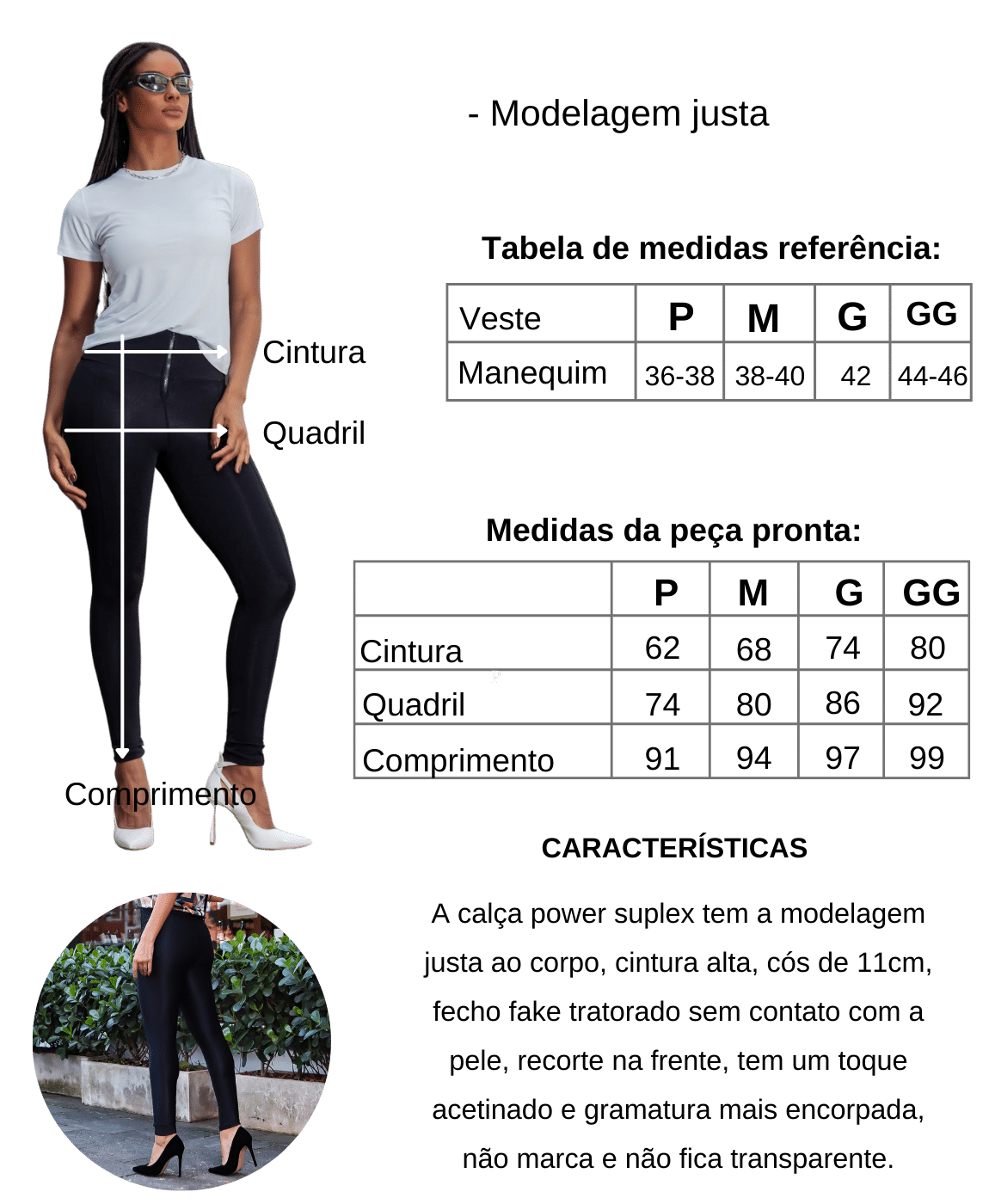 A Calça Suplex Power é a escolha perfeita. Com modelagem justa ao corpo, cintura alta para valorizar suas curvas e cós de 11cm para garantir conforto. Seu tecido acetinado de gramatura encorpada não marca o corpo e nem fica transparente, garantindo um visual impecável em qualquer situação. Além disso, o fecho fake tratorado e o recorte na frente adicionam um toque de personalidade ao look.
