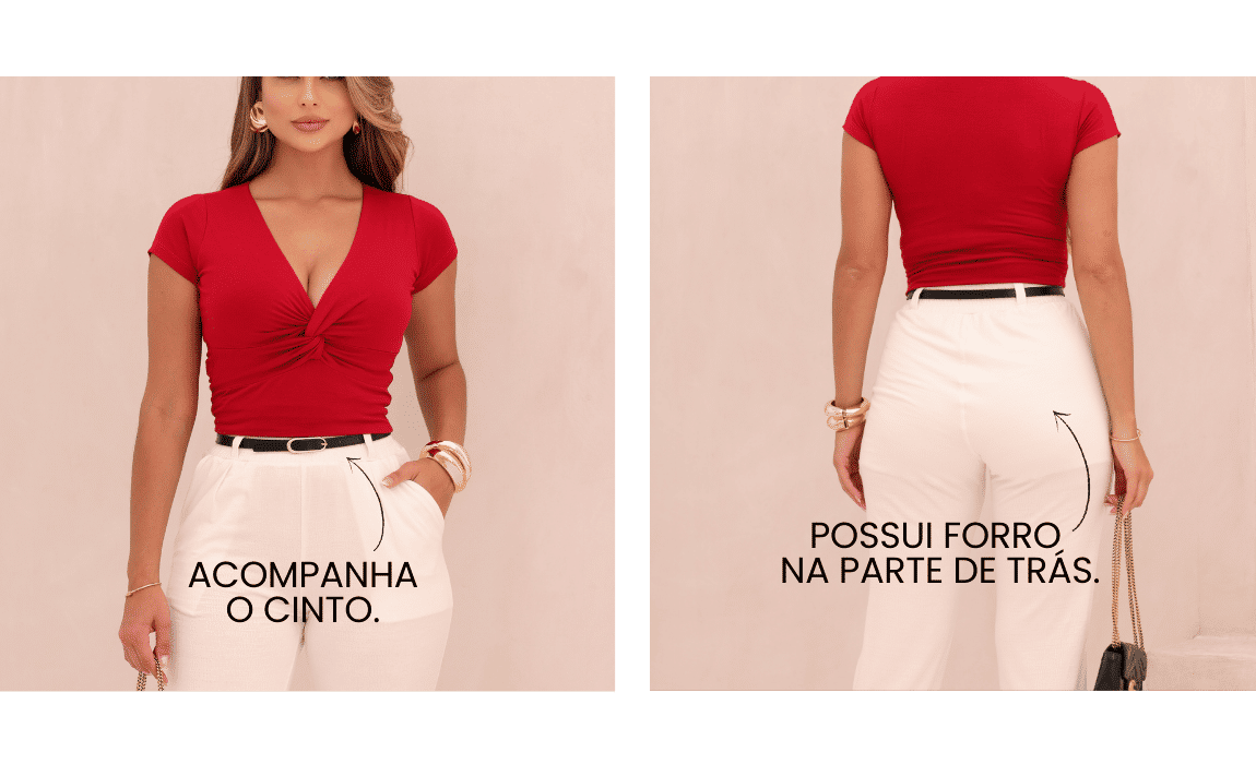 O design é enriquecido por pregas frontais que conferem um toque clássico de alfaiataria, complementado por um cós estruturado de 5 cm que define a cintura com perfeição. Prática e funcional, a peça conta com bolsos estilo faca e já acompanha um cinto exclusivo, entregando um look completo e pronto para qualquer ocasião.
