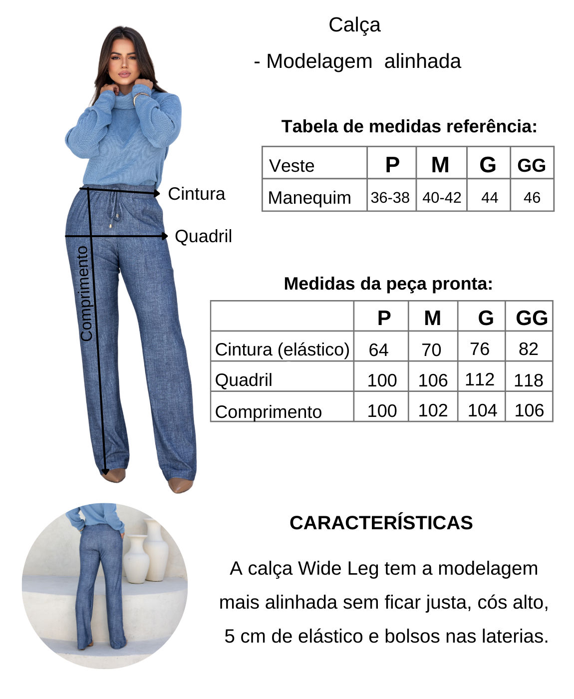A calça Wide Leg é a peça perfeita para quem busca conforto e estilo em um único item. Com sua modelagem mais solta, proporcionando liberdade de movimento e um caimento impecável. O cós alto valoriza a silhueta feminina, enquanto o elástico de 5 cm garante um ajuste perfeito e confortável. Além disso, os bolsos nas laterais são práticos e funcionais, permitindo que você carregue seus pertences com facilidade. Feita em moletinho de alta qualidade, essa calça é ideal para compor looks casuais e despojados.
