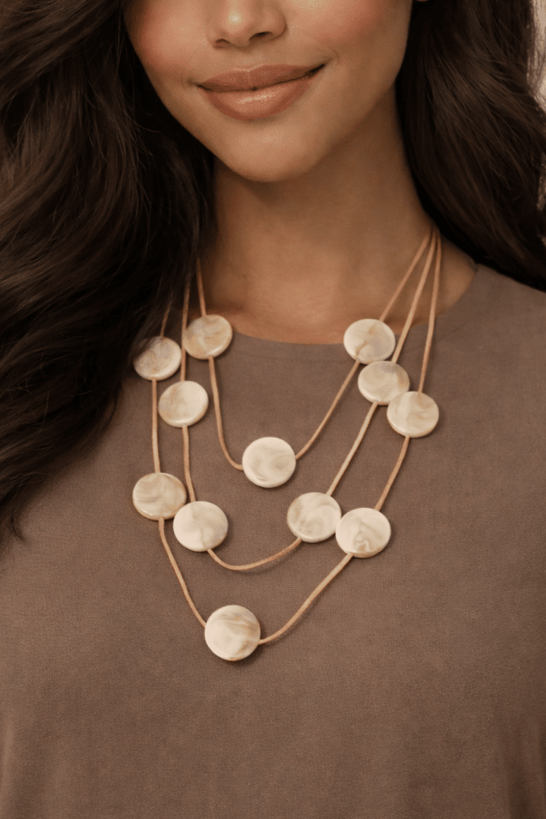 O colar valoriza o pescoço e o colo com leveza e elegância, elevando qualquer produção.