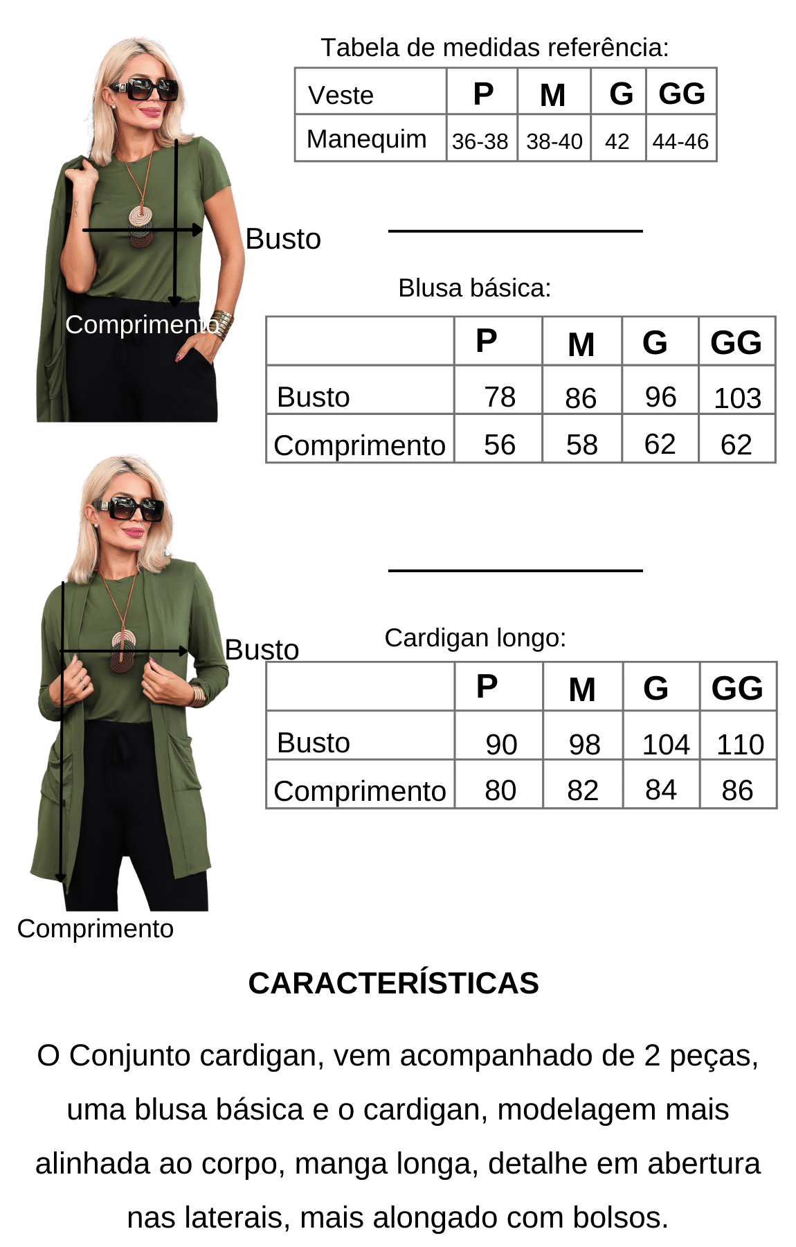 O Conjunto Cardigan Básica Longo é a peça perfeita para adicionar um toque de estilo e conforto ao seu guarda-roupa. Composto por uma blusa básica e um cardigan longo, este conjunto é ideal para mulheres que buscam praticidade e elegância em suas produções do dia a dia. A Blusa Básica possui uma modelagem mais ajustada ao corpo, garantindo um caimento perfeito. Já o Cardigan é mais alongado, com detalhes de abertura nas laterais que conferem um charme extra à peça. Além disso, conta com bolsos funcionais, perfeitos para carregar pequenos objetos ou simplesmente manter as mãos aquecidas nos dias mais frios.