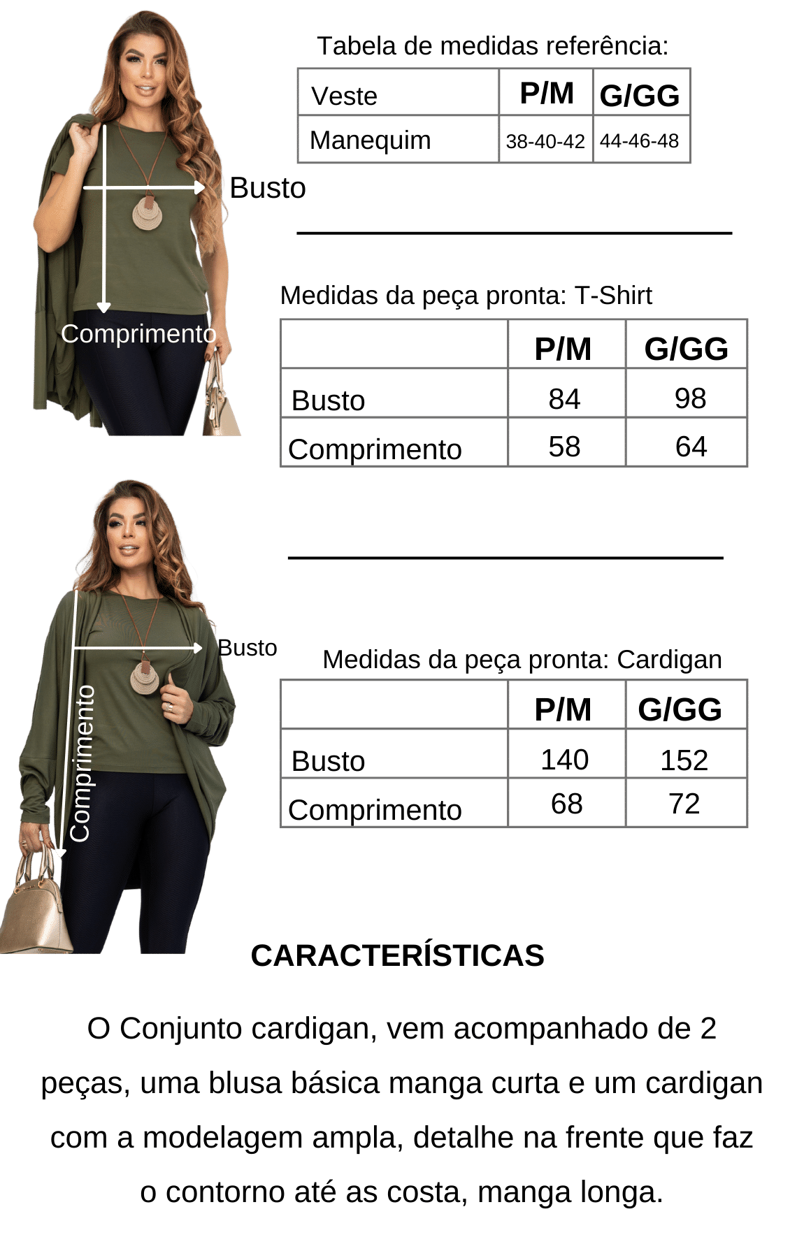 O Conjunto Cardigan T-Shirt é a peça-chave que não pode faltar no seu guarda-roupa! Ele vem com uma blusa básica de manga curta e um cardigan de modelagem ampla, com um detalhe frontal que contorna perfeitamente até as costas e mangas longas. Ideal para um look feminino e cheio de estilo!
