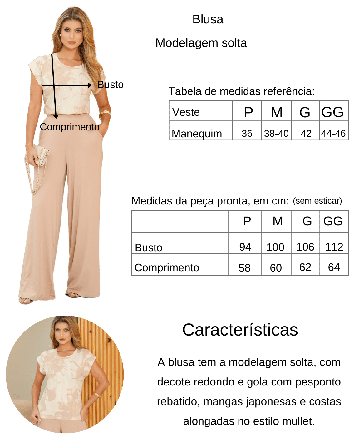 A blusa, por sua vez, é uma peça versátil e cheia de personalidade. Com decote redondo e gola com pesponto rebatido, ela é perfeita para compor looks despojados e modernos. As mangas japonesas conferem um toque de sofisticação, enquanto a parte de trás alongada no estilo mullet adiciona um charme extra ao conjunto.