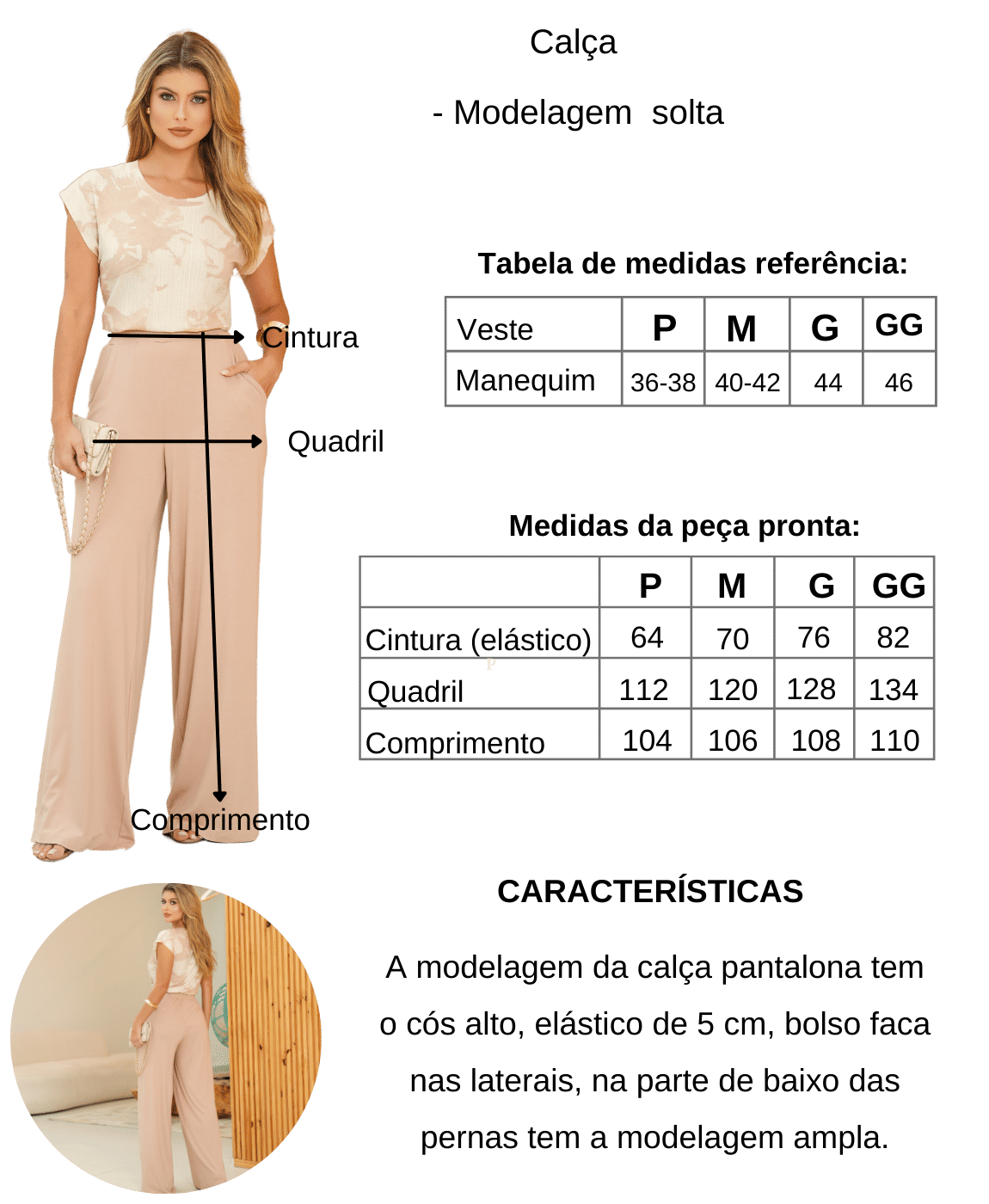 O Conjunto Pantalona é perfeito para aquelas mulheres que buscam conforto e estilo em um só produto. A calça pantalona com cós alto proporciona um caimento impecável, valorizando a silhueta feminina. Os bolsos faca nas laterais trazem praticidade para o dia a dia, enquanto a modelagem ampla nas pernas garante movimento e fluidez ao caminhar.