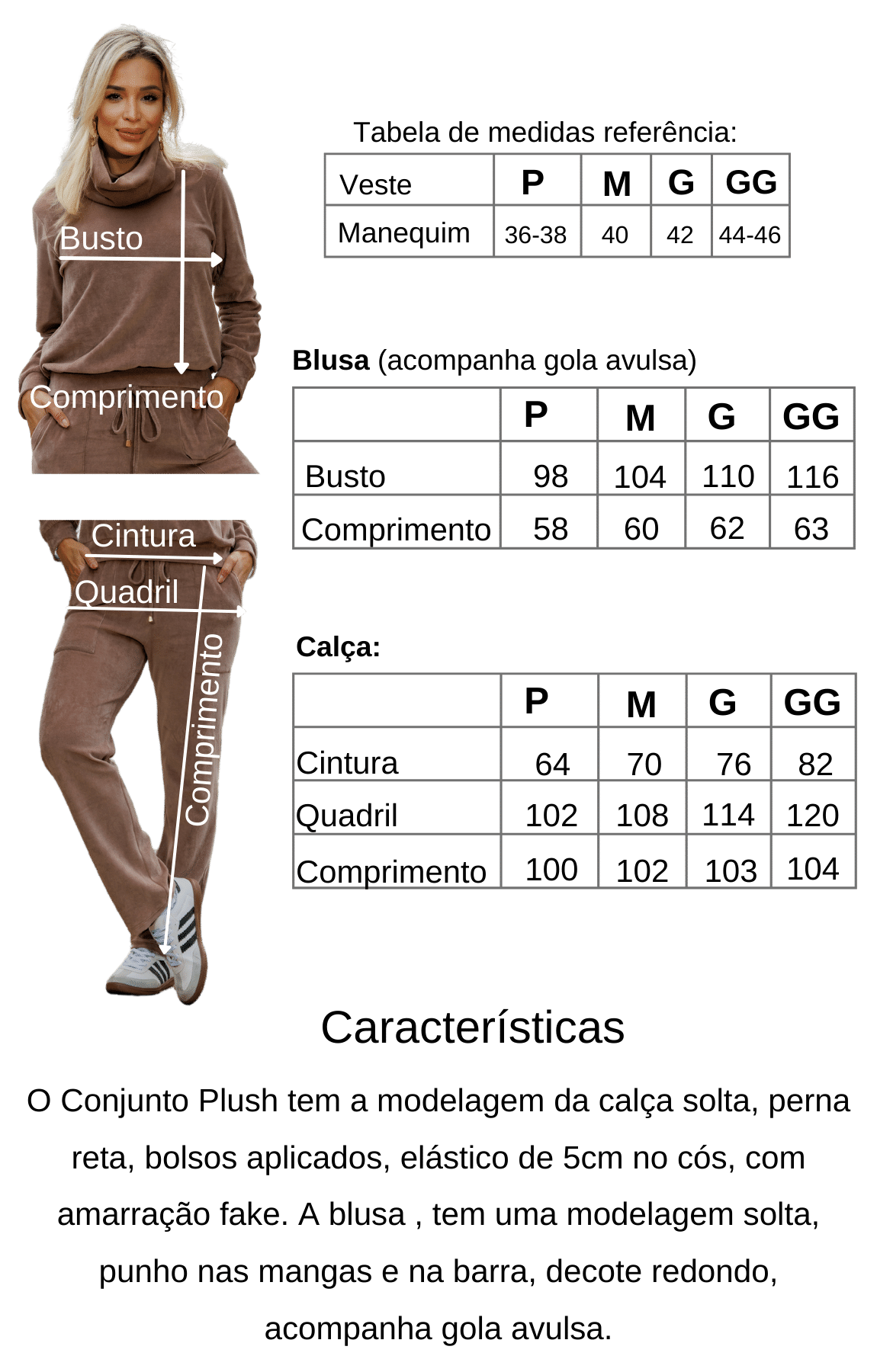 O Conjunto Plush é a combinação perfeita de conforto e estilo. A calça tem um caimento solto, pernas retas, bolsos aplicados e um elástico de 5cm no cós, com amarração fake. Já a blusa possui um design solto, punhos nas mangas e na barra, decote redondo e ainda acompanha uma gola avulsa. O Conjuno Plush é ideal para quem procura praticidade e sofisticação no dia a dia.