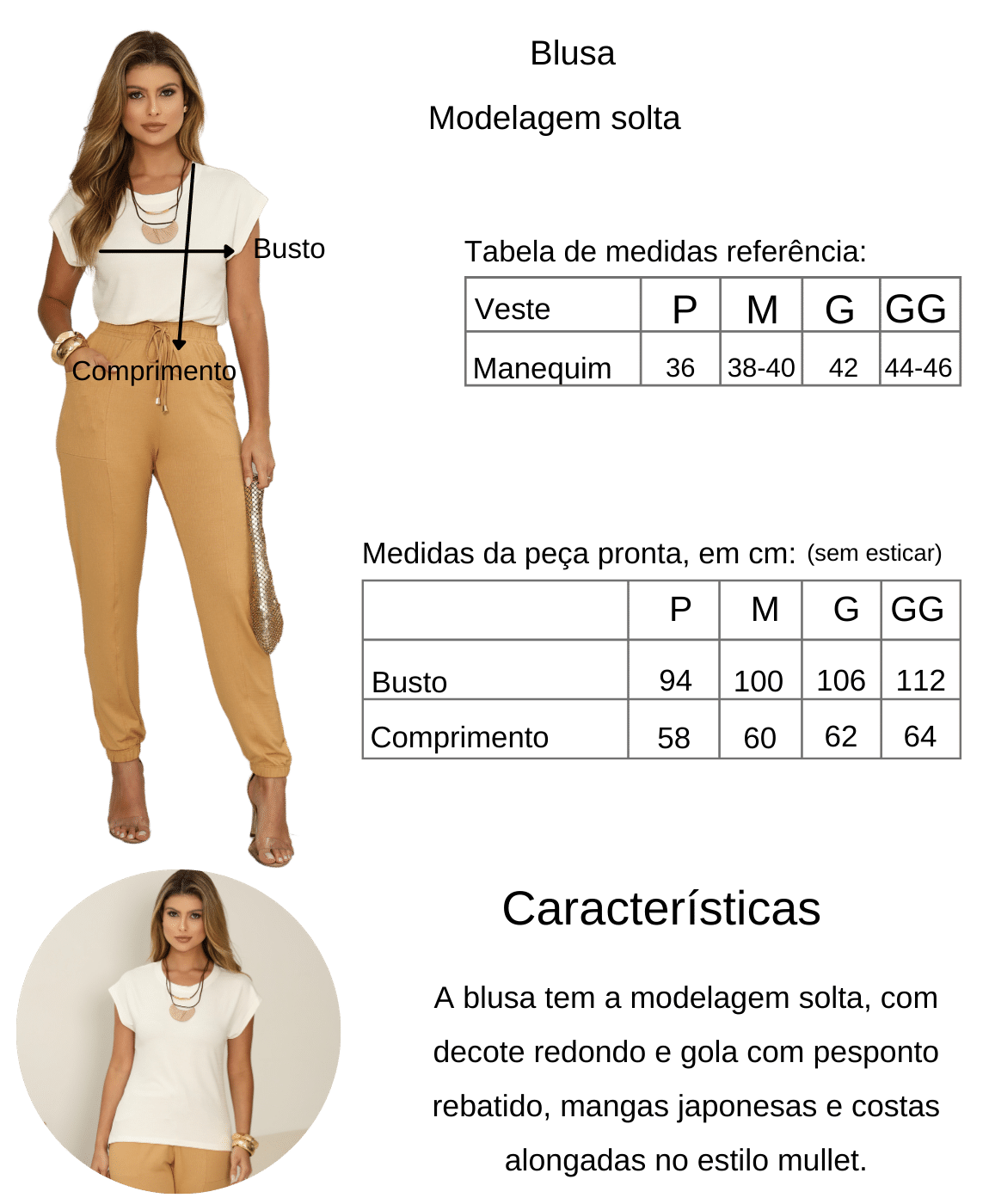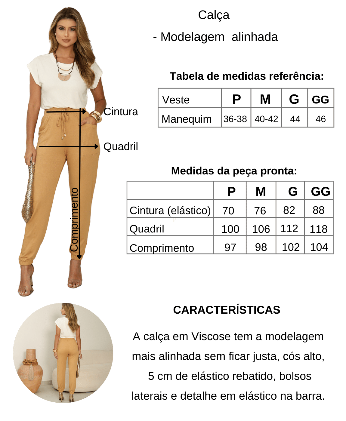 Este conjunto é perfeito para quem gosta de se vestir de forma descontraída, mas sem perder a elegância. A blusa solta com decote redondo e mangas japonesas, modelagem mais alongada nas costas cobrindo o quadril traz um toque de conforto, enquanto a calça em Viscose com cós alto e detalhe em elástico na barra garante um ajuste perfeito ao corpo. Além disso, os bolsos laterais são super práticos para carregar pequenos objetos. Ideal para um dia de passeio no parque, um almoço com as amigas ou até mesmo para um dia de trabalho mais descontraído. Acompanha o colar da cor da calça.
