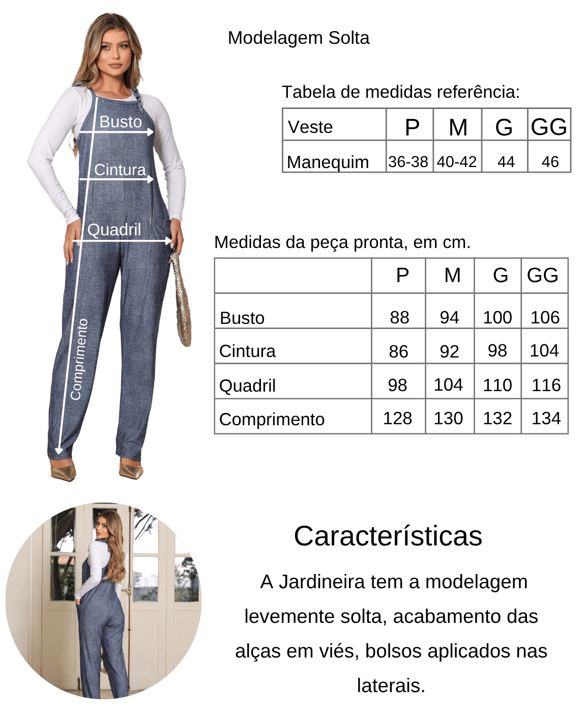 Feita para a mulher moderna que busca praticidade sem abrir mão do estilo, a jardineira é a escolha ideal para um look casual e despojado. Combine com uma camiseta básica e tênis para um visual descontraído no dia a dia, ou aposte em uma blusa mais elegante e sandálias para um look mais arrumado.