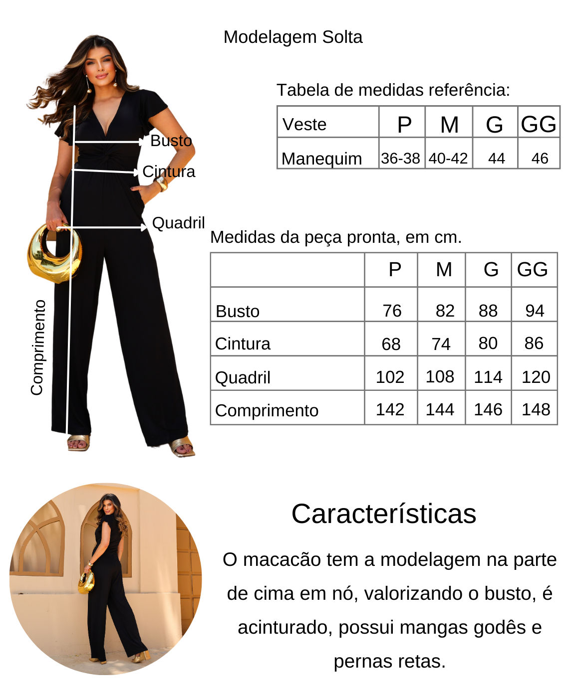 Se você procura uma peça única e cheia de estilo para arrasar em qualquer ocasião, o Macacão Busto Nó é a escolha perfeita para você! Com a modelagem na parte de cima em nó, que valoriza o busto e dá um toque de charme extra ao look. Além disso, o Macacão Busto Nó é acinturado, o que garante um caimento impecável. As mangas godês dão um ar romântico e delicado à peça, enquanto as pernas retas conferem um toque de elegância e sofisticação.