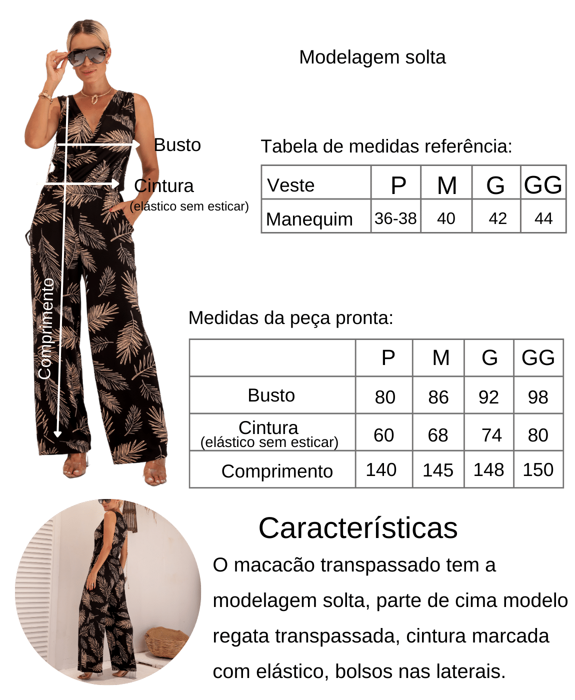 O Macacão Transpassado é a peça perfeita para as mulheres que buscam conforto e estilo em um só look. Com sua modelagem solta e fluida, o Macacão Transpassado proporciona liberdade de movimento e um caimento impecável. A parte de cima em modelo regata transpassada adiciona um toque de sofisticação, enquanto a cintura marcada com elástico valoriza a silhueta feminina.
