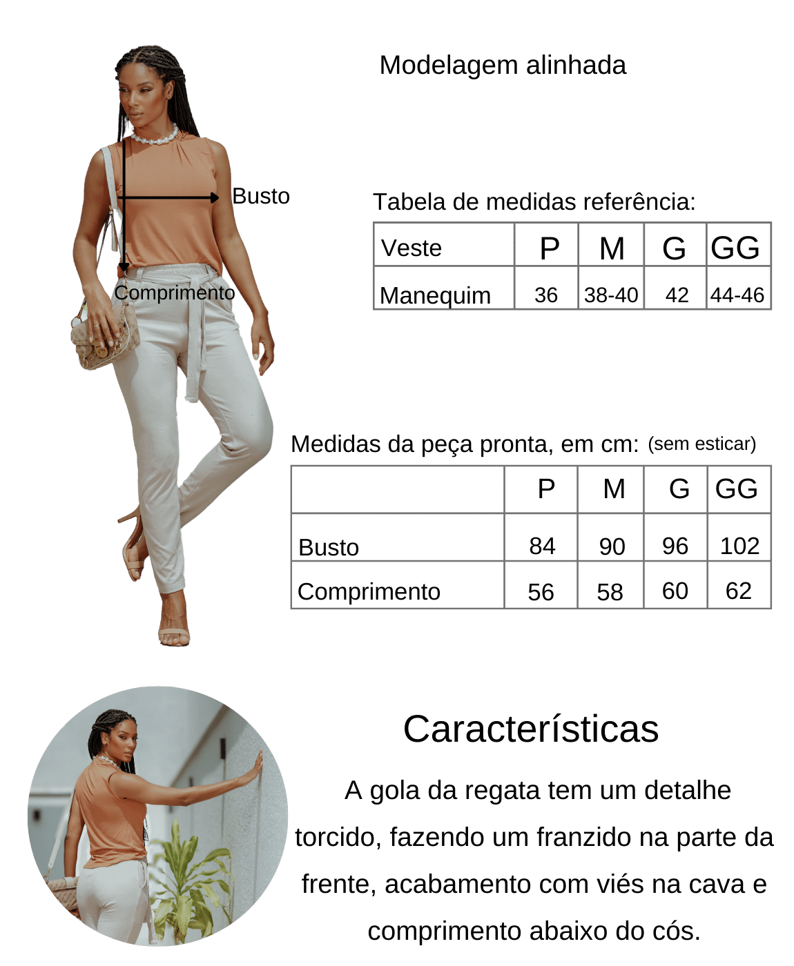 A regata torcida é a peça perfeita para as mulheres que buscam um visual casual e cheio de estilo. Com um detalhe torcido na gola que cria um drapeado na parte da frente, essa regata é perfeita para dar um toque de originalidade ao seu look. O acabamento com viés na cava garante um caimento impecável, enquanto o comprimento abaixo do cós proporciona um visual moderno e despojado. Ideal para combinar com saias ou calças, essa regata é versátil e pode ser usada em diversas ocasiões. Seja para um passeio no parque, um almoço com as amigas ou um happy hour, a regata torcida é a escolha certa para quem busca conforto e estilo.