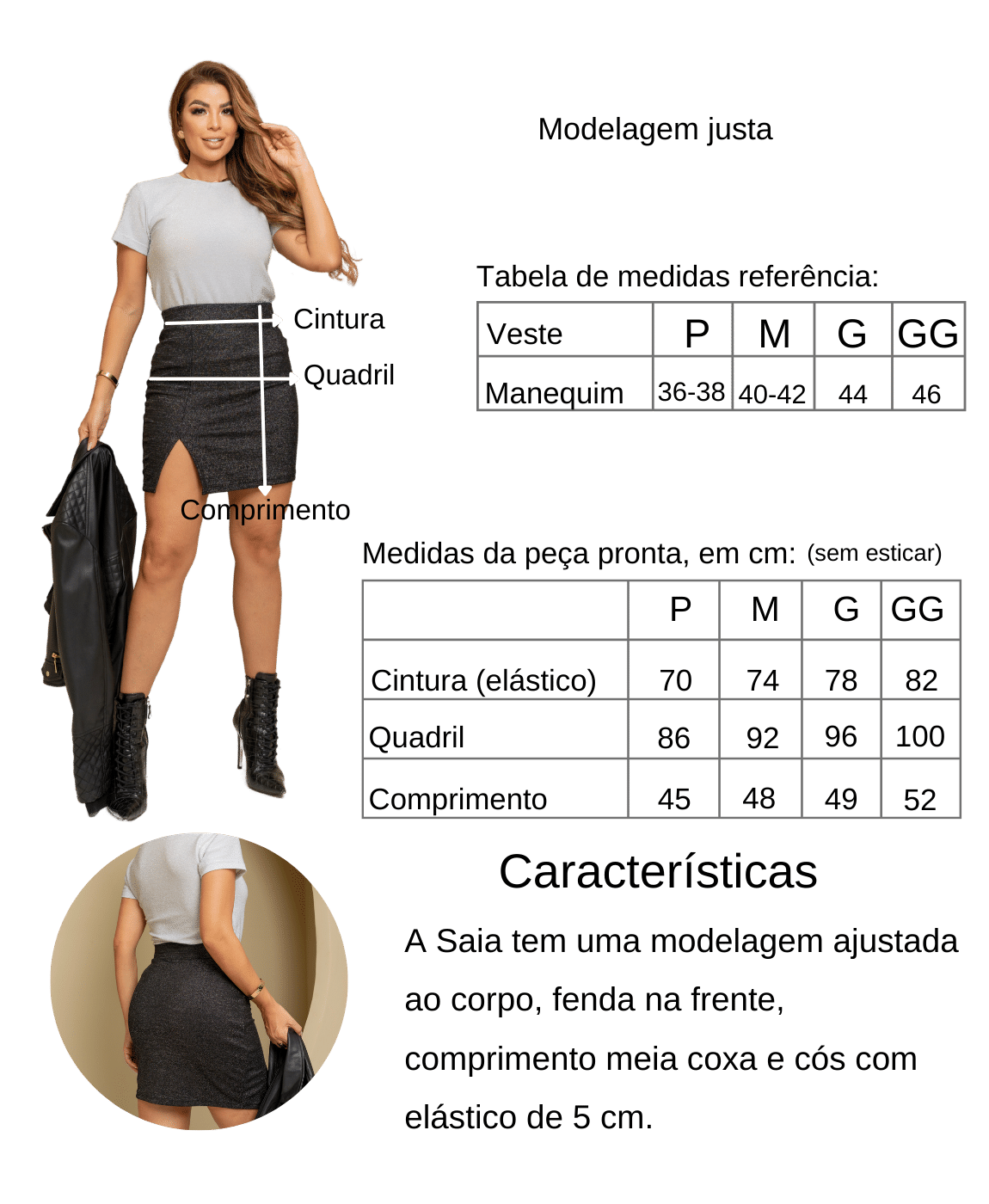 A Saia Lurex Com Fenda é a peça perfeita para mulheres que querem adicionar um toque de brilho e glamour ao seu visual casual. Com uma modelagem ajustada ao corpo, essa Saia Lurex Com Fenda valoriza as curvas femininas de forma elegante e sofisticada. A fenda na frente dá um toque de sensualidade na medida certa. Comprimento meia coxa e cós com elástico de 5 cm