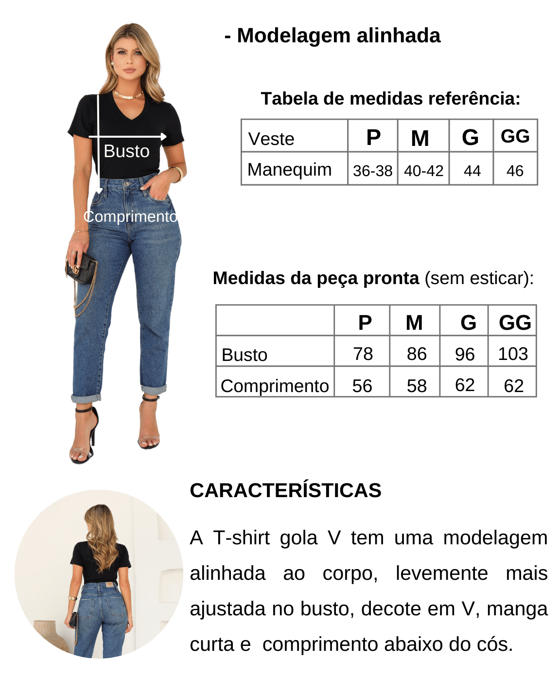 A T-Shirt gola V é a escolha perfeita para quem busca peças mais alinhadas ao corpo, com um decote em V elegante, mangas curtas e um comprimento abaixo do cós. Ideal para um visual casual e confortável, esta T-Shirt é versátil e pode ser combinada com peças básicas, como calça jeans e tênis, ou até mesmo peças mais sofisticadas, como calças de alfaiataria e sapatos de salto alto. Ter algumas blusas básicas como essa em seu guarda-roupa é uma ótima opção para garantir variedade de looks.