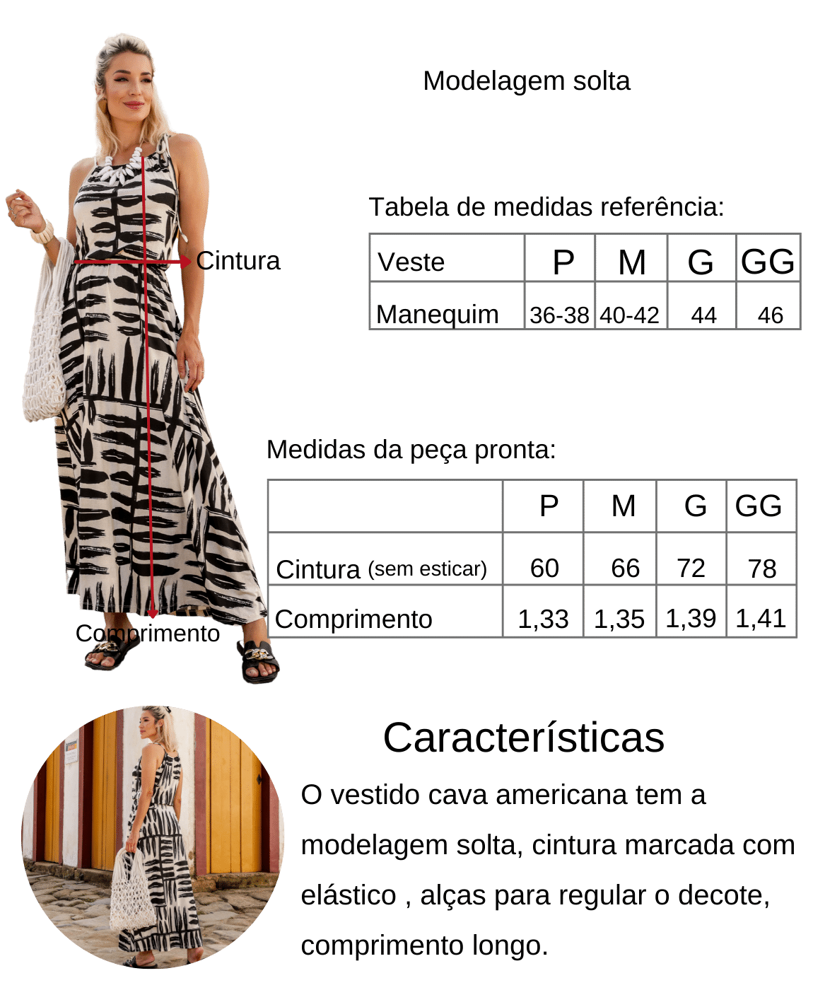 O Vestido Cava Americana foi projetado para proporcionar conforto e estilo, com uma modelagem solta, cintura marcada por elástico, alças ajustáveis para regular o decote e um comprimento longo. O Vestido Cava Americana é ideal para quem busca um look casual e despojado.