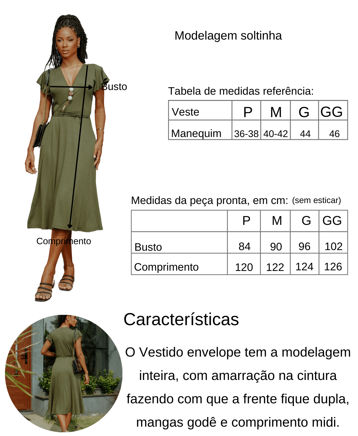 O Vestido Envelope traz um design único, com amarração na cintura que cria um efeito duplo na frente, mangas godê e comprimento midi. Ideal para um visual descontraído e elegante ao mesmo tempo.
