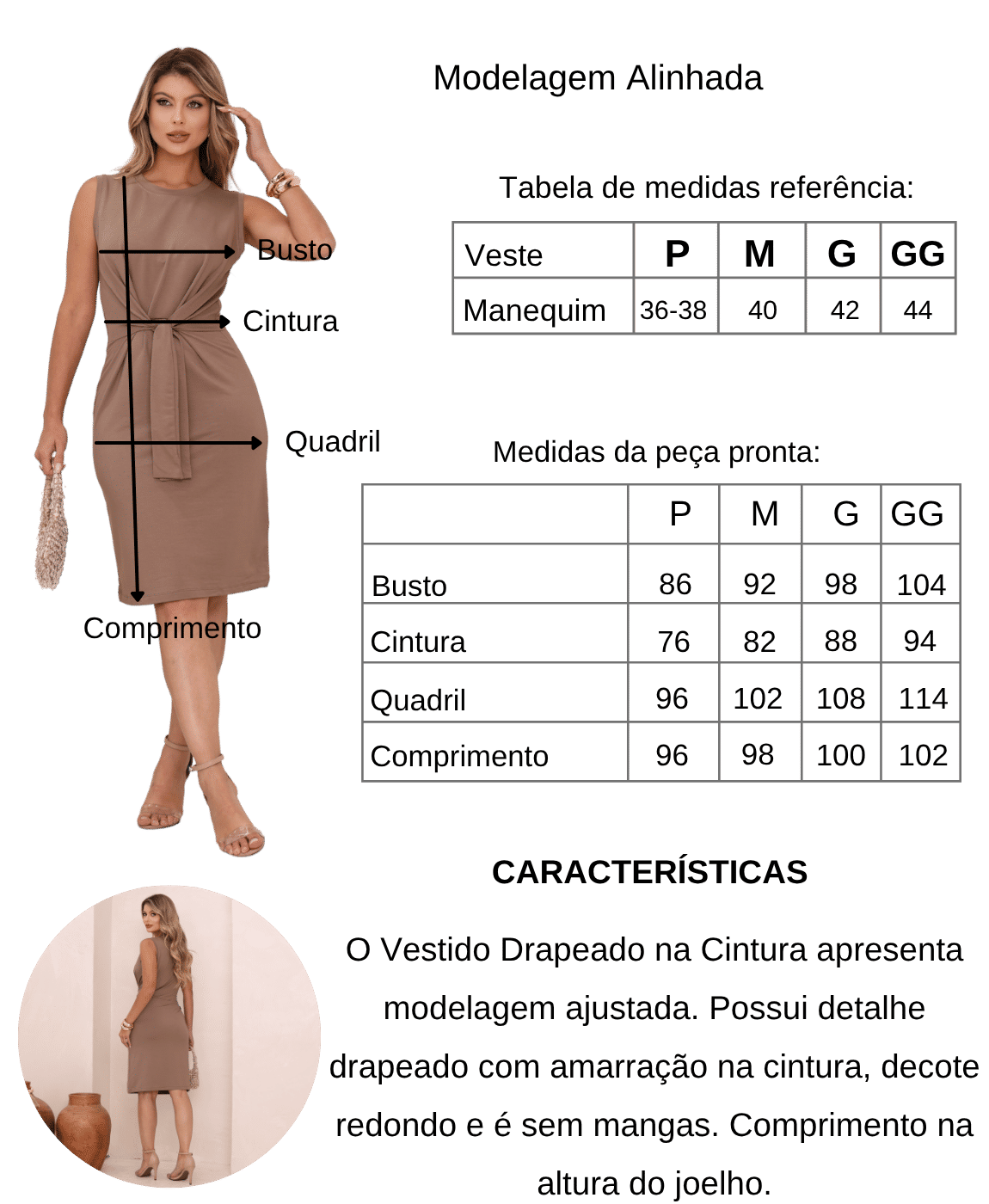 O Vestido Drapeado na Cintura traz uma modelagem alinhada que valoriza as formas com elegância. O destaque fica por conta do drapeado com amarração na cintura, permitindo ajuste conforme a preferência e proporcionando um caimento impecável. Com decote redondo, sem mangas e comprimento na altura do joelho, é uma peça versátil e sofisticada, ideal para diversas ocasiões.