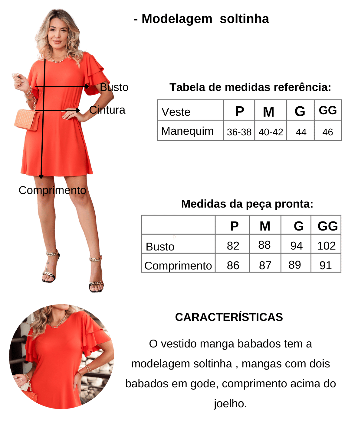 O Vestido Manga Babados possui um caimento soltinho, mangas com dois babados em godê e comprimento acima do joelho. Ideal para um look descontraído e cheio de estilo.