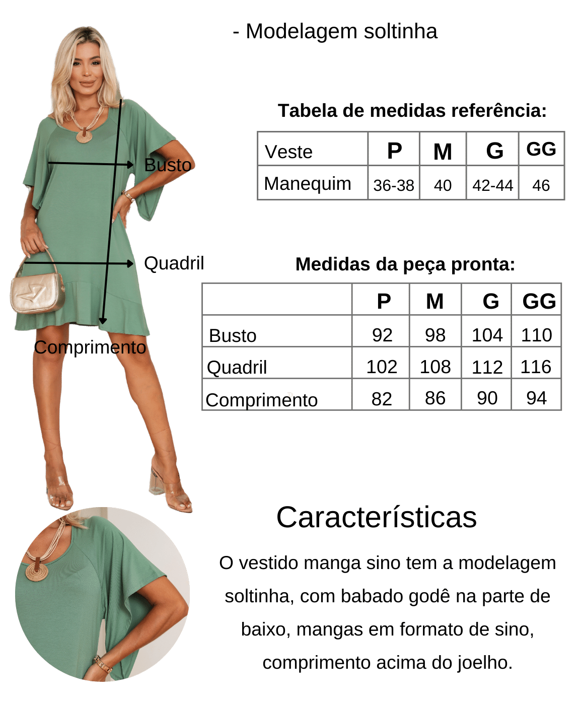 O Vestido Manga Sino possui um caimento leve e fluido, com um elegante babado godê na barra, mangas em formato de sino e um comprimento acima do joelho. Perfeito para um look descontraído e cheio de estilo!