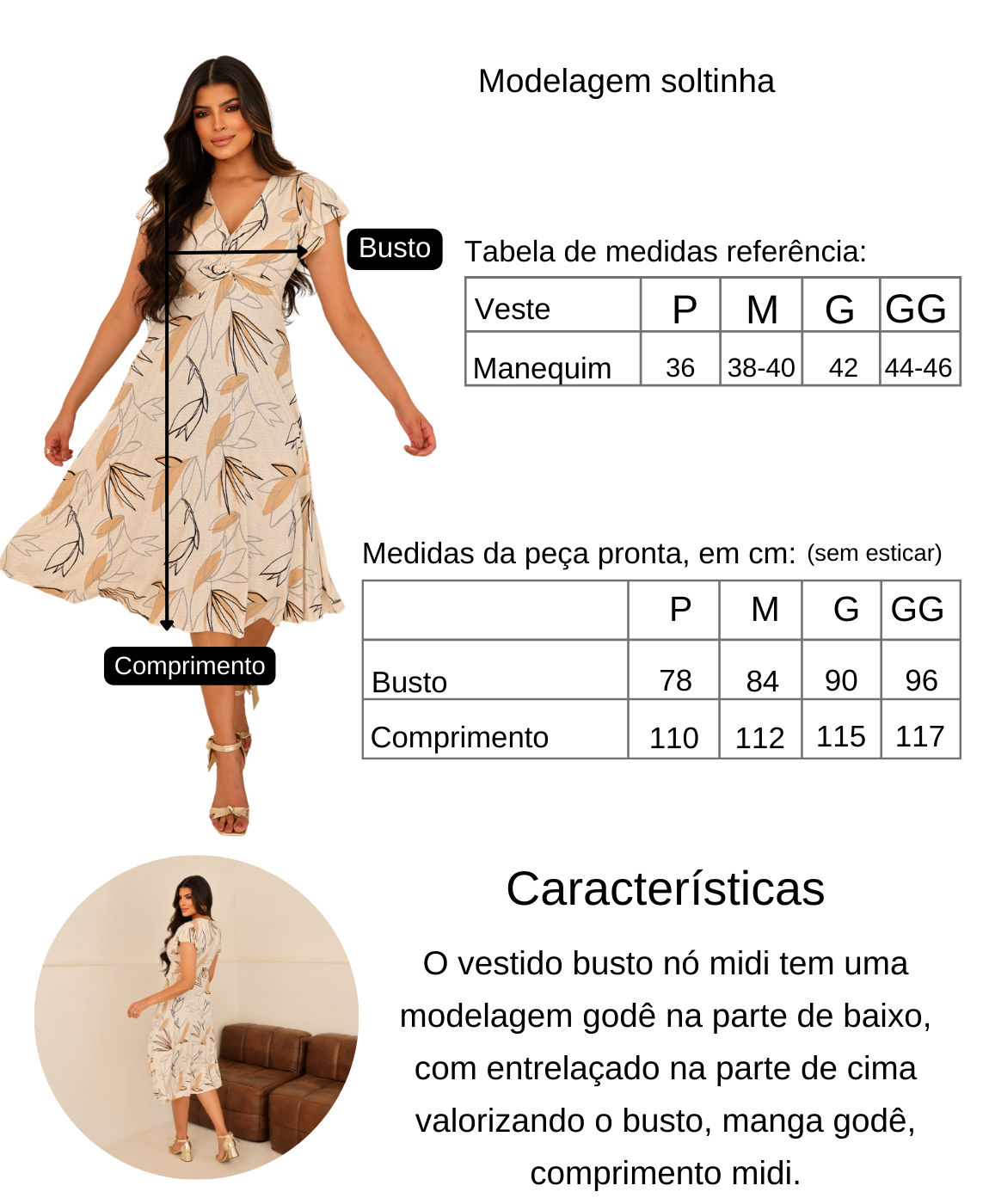 Um modelo leve, elegante e cheio de charme. O vestido midi conta com decote em V, mangas curtas fluídas e detalhe de amarração frontal, que valoriza a silhueta com delicadeza. Sua estampa com folhas em tons neutros e terrosos traz um toque moderno e atemporal, perfeito para diversas ocasiões. Confeccionado em tecido confortável e com ótimo caimento, é uma peça versátil que pode ser usada tanto no dia a dia quanto em eventos mais especiais. Combine com sandálias ou rasteiras para um look descontraído, ou aposte em saltos para uma produção sofisticada.