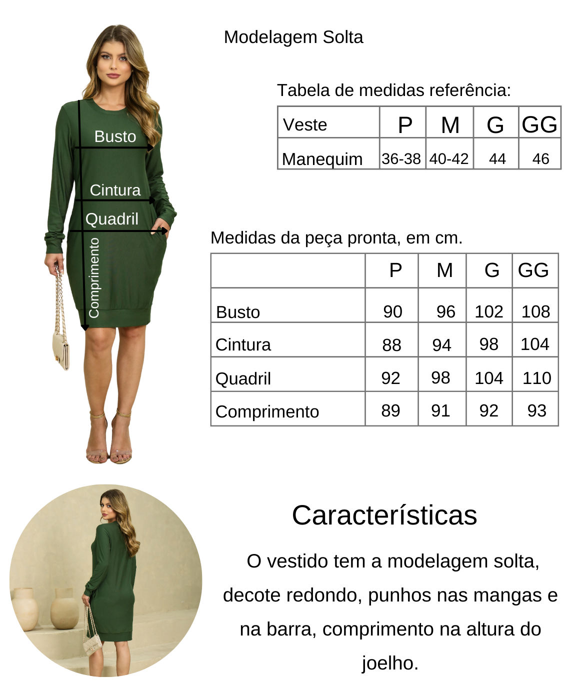 O vestido moletinho é a peça perfeita para as mulheres que buscam conforto e estilo em um só item. Com modelagem solta e decote redondo, ele é ideal para os dias em que você quer se sentir à vontade sem perder a elegância. Os punhos nas mangas e na barra dão um toque moderno e despojado, enquanto o comprimento na altura do joelho garante praticidade e versatilidade.